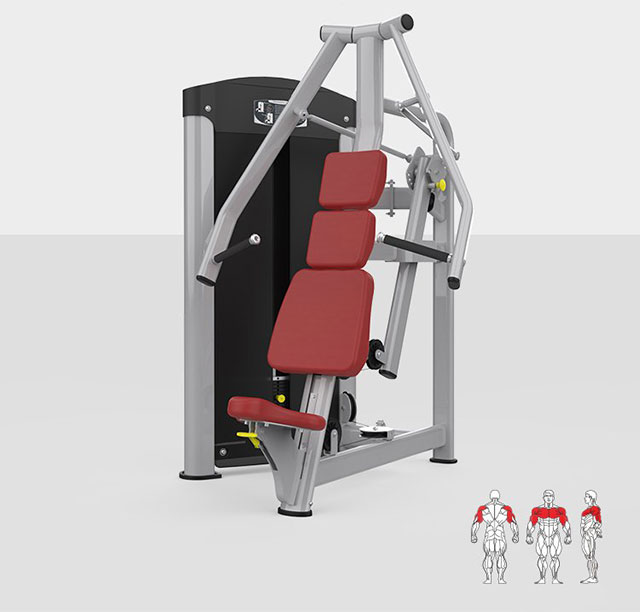 肩部推舉機和坐式推胸訓練器使用方法大致相當,無非一個往前,一個往上,開始訓練之前,都需要把作為調整到適合自己的位置。