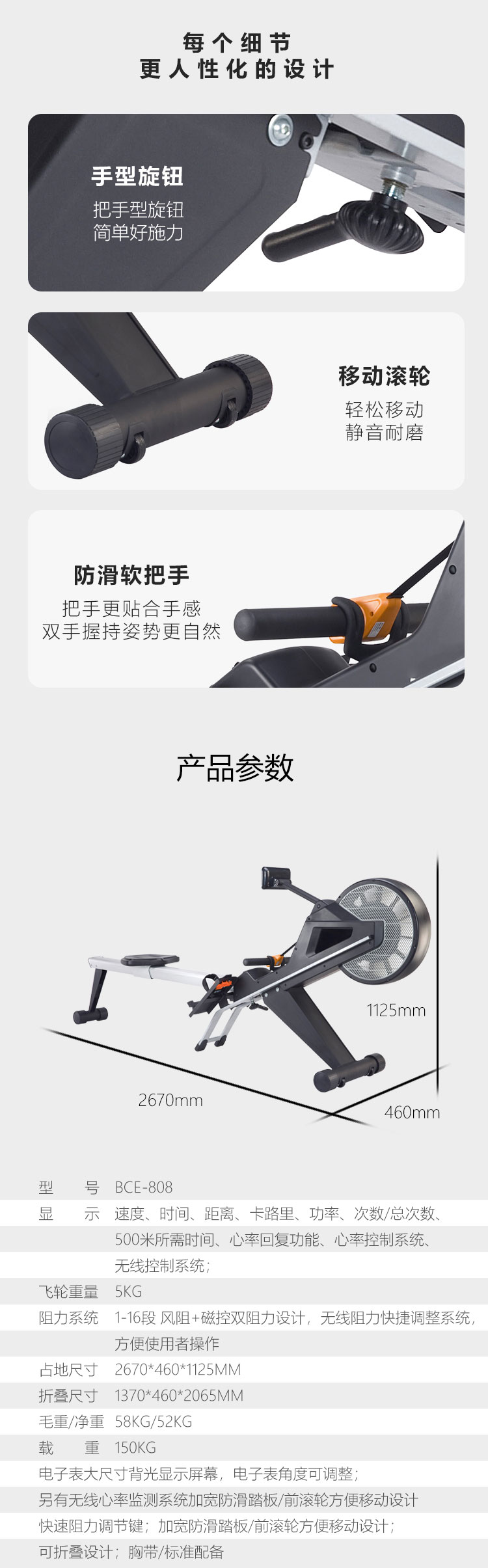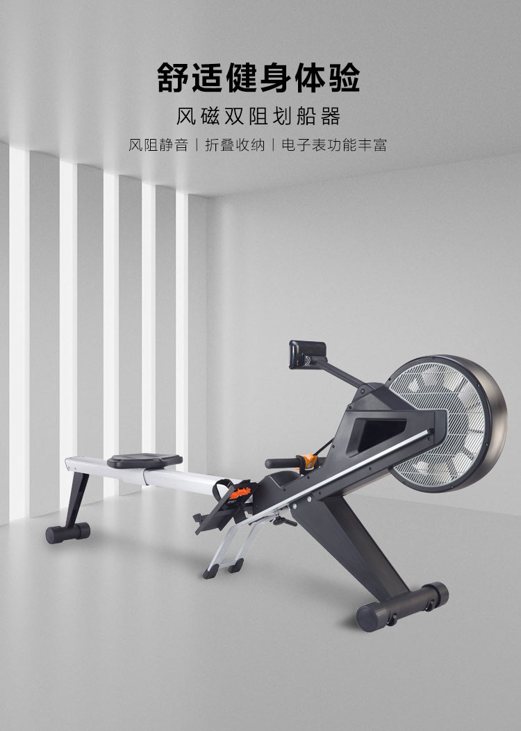 6. 顯示屏:速度、時間、距離、卡路裏、功率、次數/總次數、500米所需時間、心率回複功能、心率控製係統、無線控製係統;