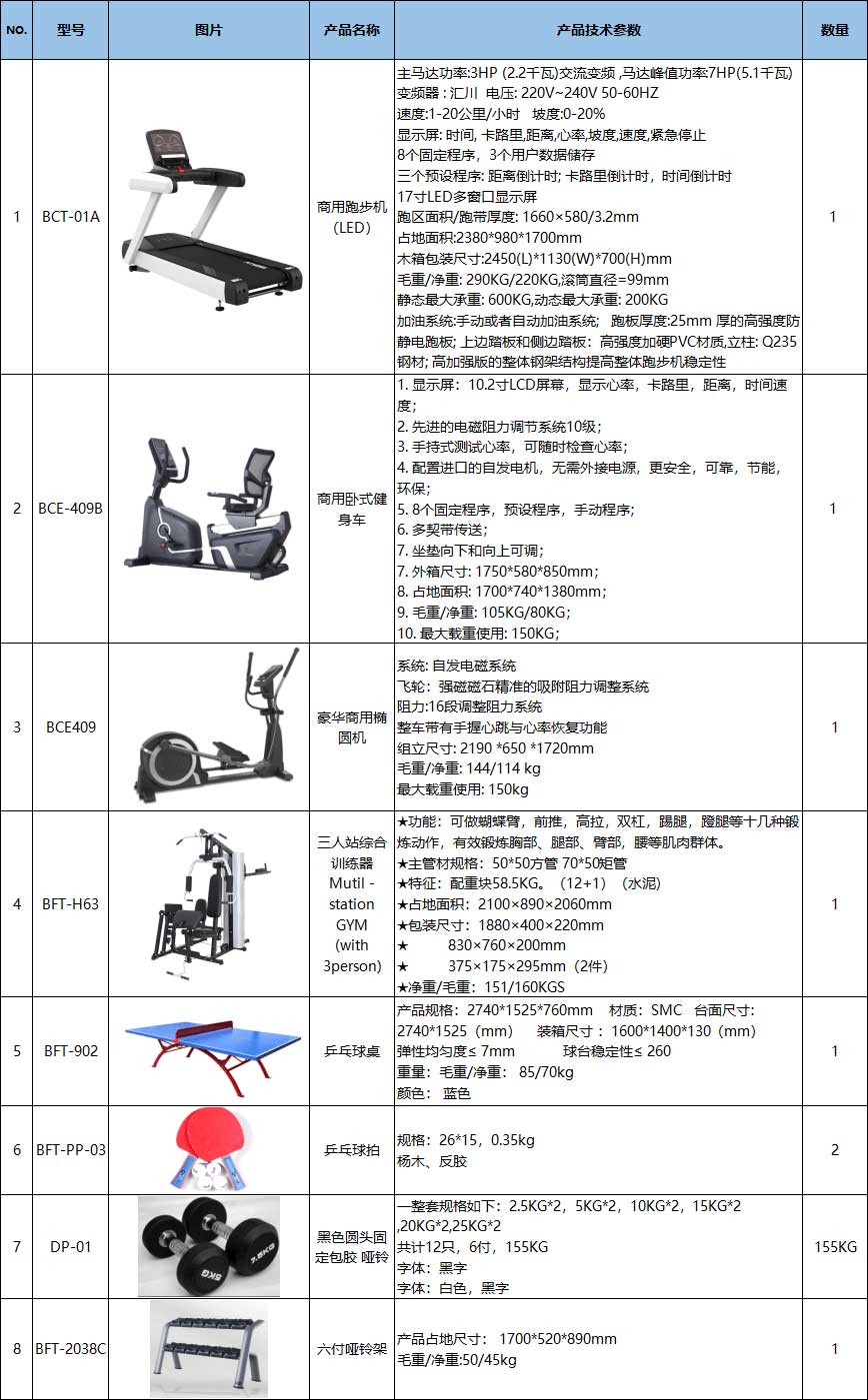 家裏如果有足夠的空間,可以選擇體積較大的運動器材或器材組合,如:綜合訓練器、跑步機、橢圓機等等。如果空間有限可以選擇對空間要求小的,比如:瑜伽墊,啞鈴,筋膜槍等小件健身器材。具體案例詳細的器材清單如下: